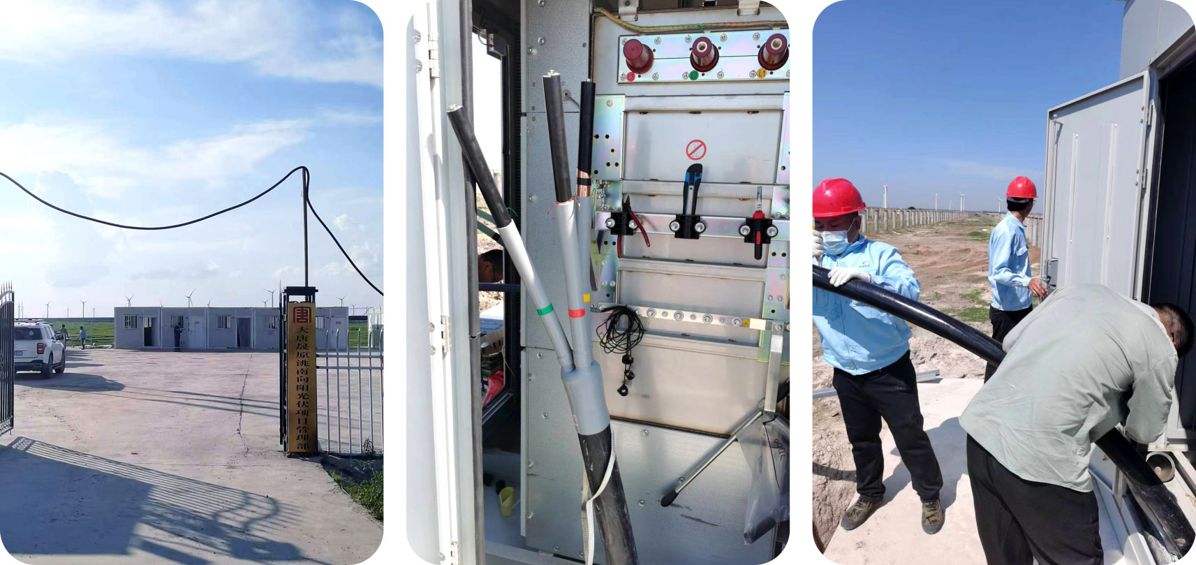 吉林省白城市洮南市地處大興安嶺東麓平原區(qū),由大唐集團(tuán)投資興建的150兆瓦風(fēng)電光電互補(bǔ)項(xiàng)目就坐落于洮南市東方紅畜牧場(chǎng),一座座巨大的風(fēng)力發(fā)電機(jī)矗立在一望無垠、藍(lán)天白云的平原上,一排排太陽(yáng)能光伏板有序分布在方圓20公里場(chǎng)地內(nèi)!該項(xiàng)目使用的35kV電纜附件均是由深圳市創(chuàng)銀科技股份有限公司自主研發(fā)和生產(chǎn),50個(gè)箱變的電纜附件也是由創(chuàng)銀科技全力安裝完成!