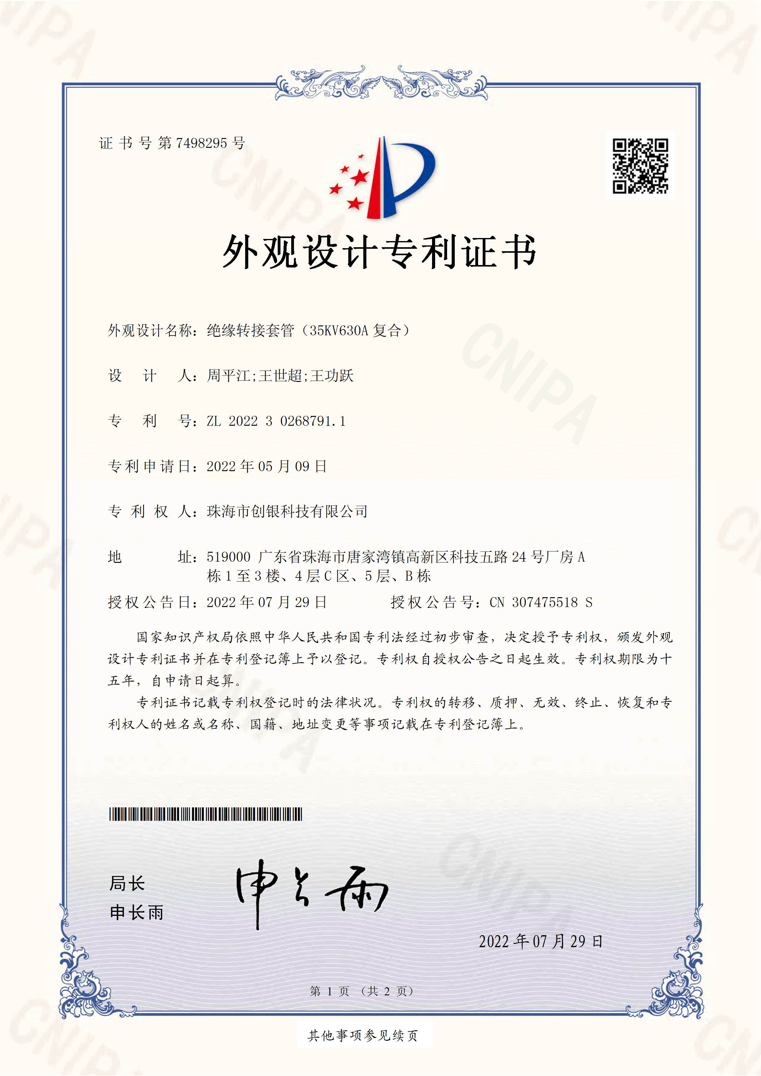 7月29日,珠海市創(chuàng)銀科技有限公司又有四項科技創(chuàng)新成果再次榮獲國家知識產(chǎn)權(quán)局頒發(fā)的外觀設(shè)計專利證書——“插頭(66kV)”、“絕緣套管(24kV新型復(fù)合)”、“絕緣套管(36kV新型復(fù)合)”、“絕緣轉(zhuǎn)接套管(35KV630A復(fù)合)”,此次四項國家專利的獲得,是創(chuàng)銀科技在創(chuàng)新知識產(chǎn)權(quán)工作上取得的又一科技成果。