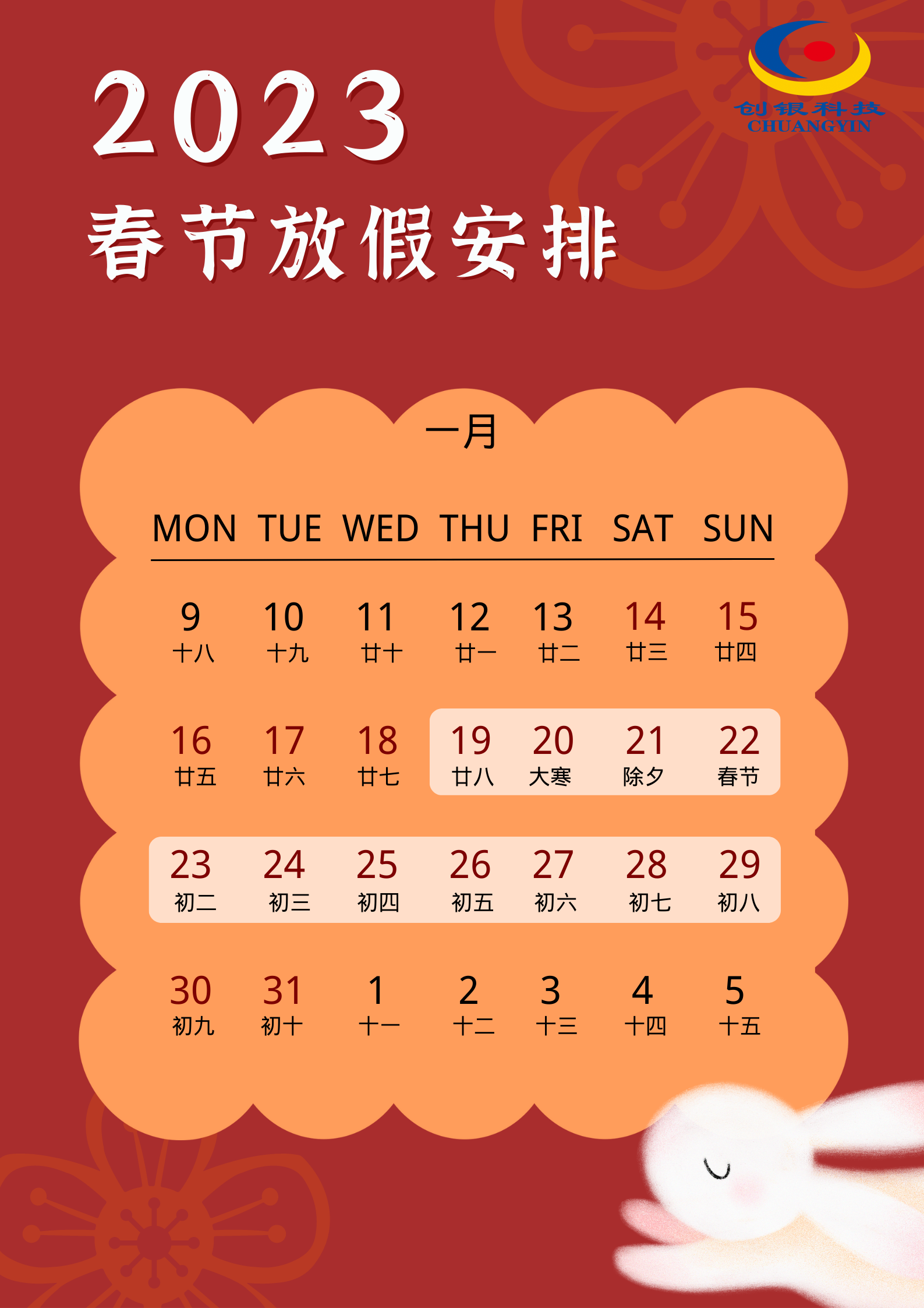 放假時間:2023年1月19(臘月二十八)至1月29日(正月初八),共11天,1月30日(正月初九)正常上班!